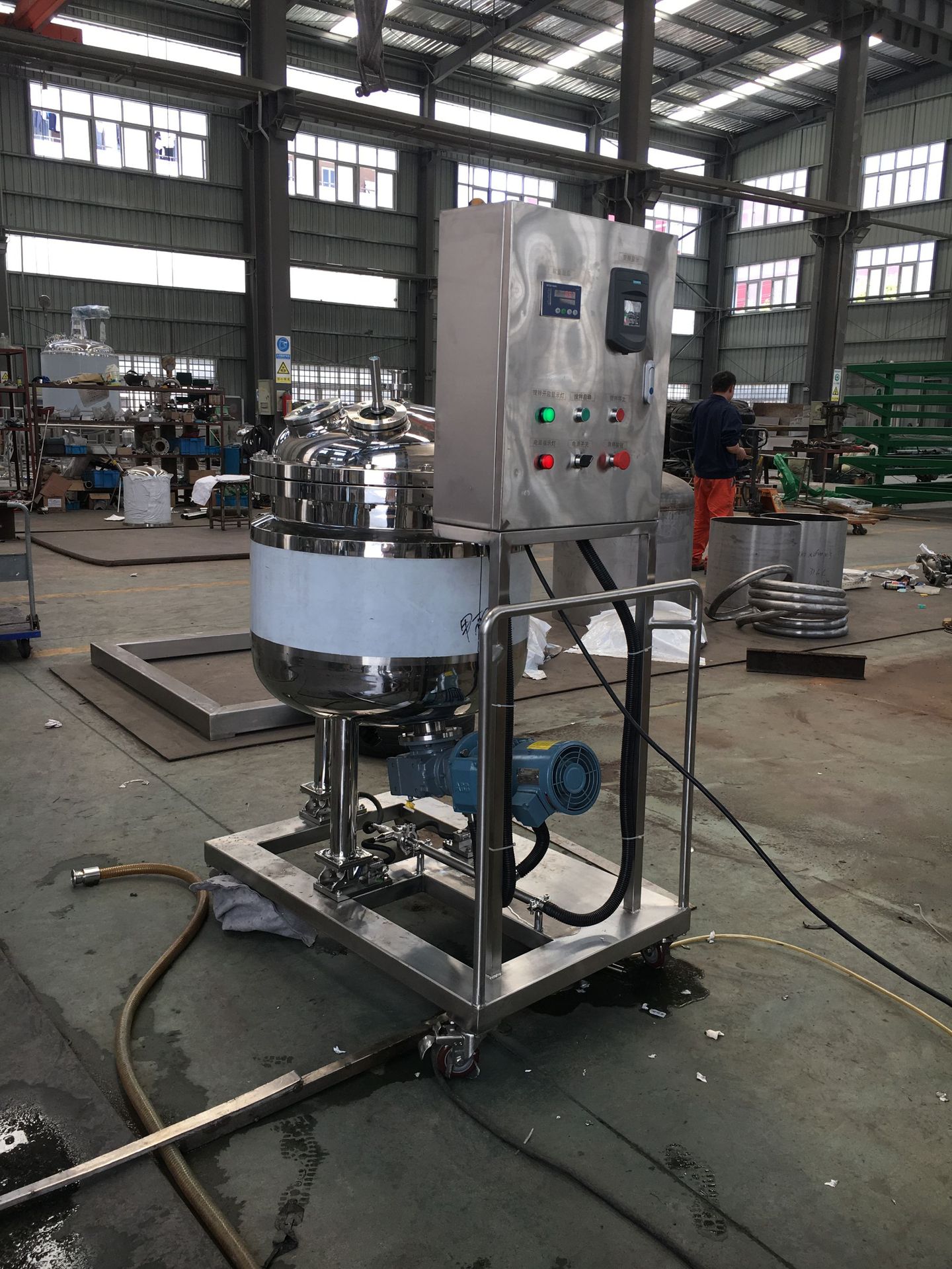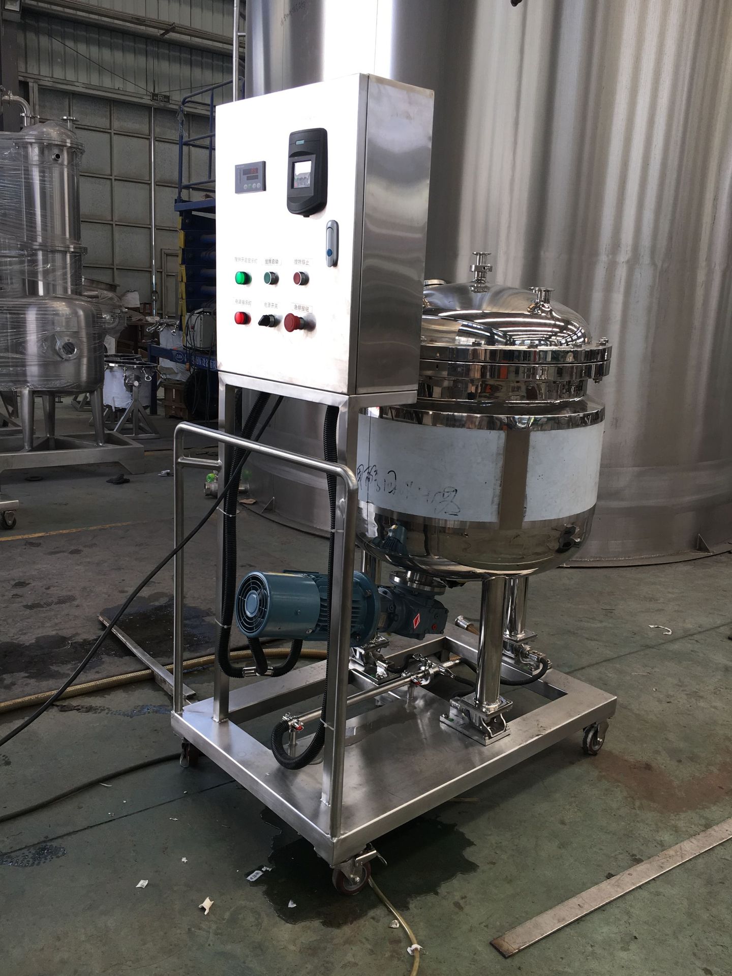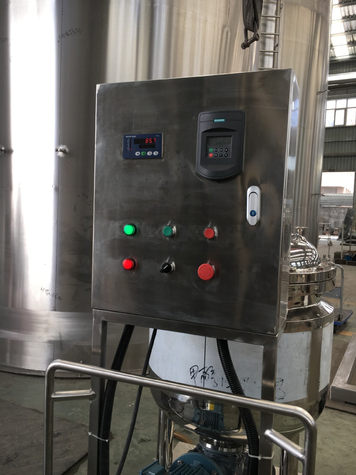 4、温度控制:采用电热偶测量温度与温控仪连接进行测控温度(温差±≤1°C),并可调节物料温度的高低。温控仪安装在电控箱内,温度传输杆直插至罐内底部,使料液用到最低位置也能指示出温度。
